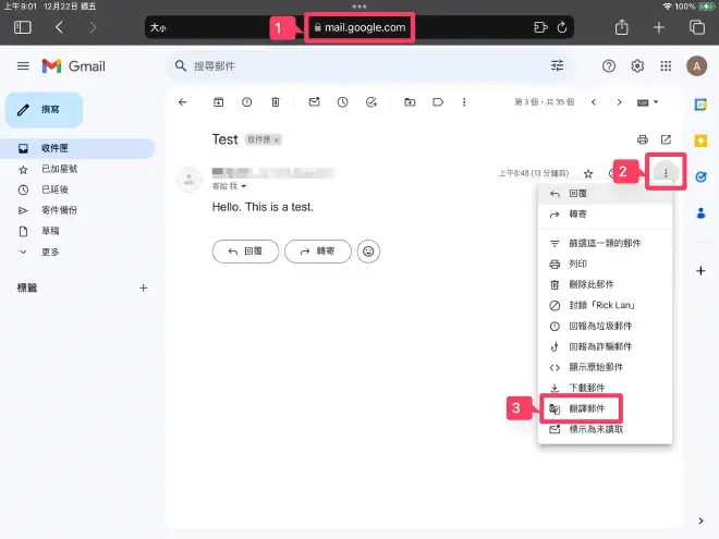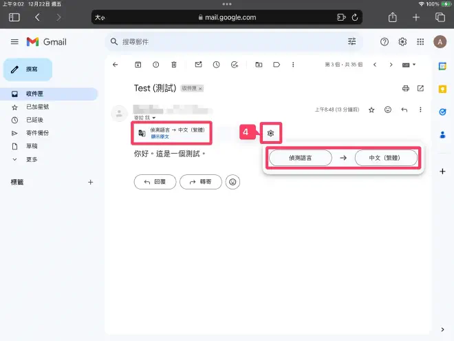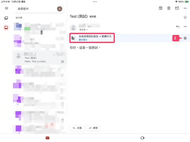 如何將Gmail電子郵件翻譯成中文2021-01-20·Updated: 2023-12-22Tech Support Ios 中文Table of Contents從 iPad 上 Safari 瀏覽器從 iPad 上 Gmail APP從 iPhone 上 Gmail APP如何將 Gmail 電子郵件翻譯成中文從 iPad 上 Safari 瀏覽器從 iPad 上 Gmail APP從 iPhone 上 Gmail APP從 iPad 上 Safari 瀏覽器 #瀏覽: https://mail.google.com/步驟:從 iPad 上 Safari 瀏覽器 (1)從 iPad 上 Safari 瀏覽器 (2)從 iPad 上 Gmail APP #開啟 Gmail APP.從 iPad 上 Gmail APP (1)從 iPad 上 Gmail APP (2)從 iPad 上 Gmail APP (3)從 iPad 上 Gmail APP (4)從 iPhone 上 Gmail APP #開啟 Gmail APP.從 iPhone 上 Gmail APP (1)從 iPhone 上 Gmail APP (2)從 iPhone 上 Gmail APP (3)從 iPhone 上 Gmail APP (4)